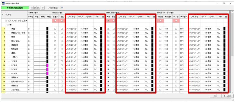 作業線の作業名、実働・暦日、開始日・終了日のフォント情報(フォント名・サイズ・スタイル・